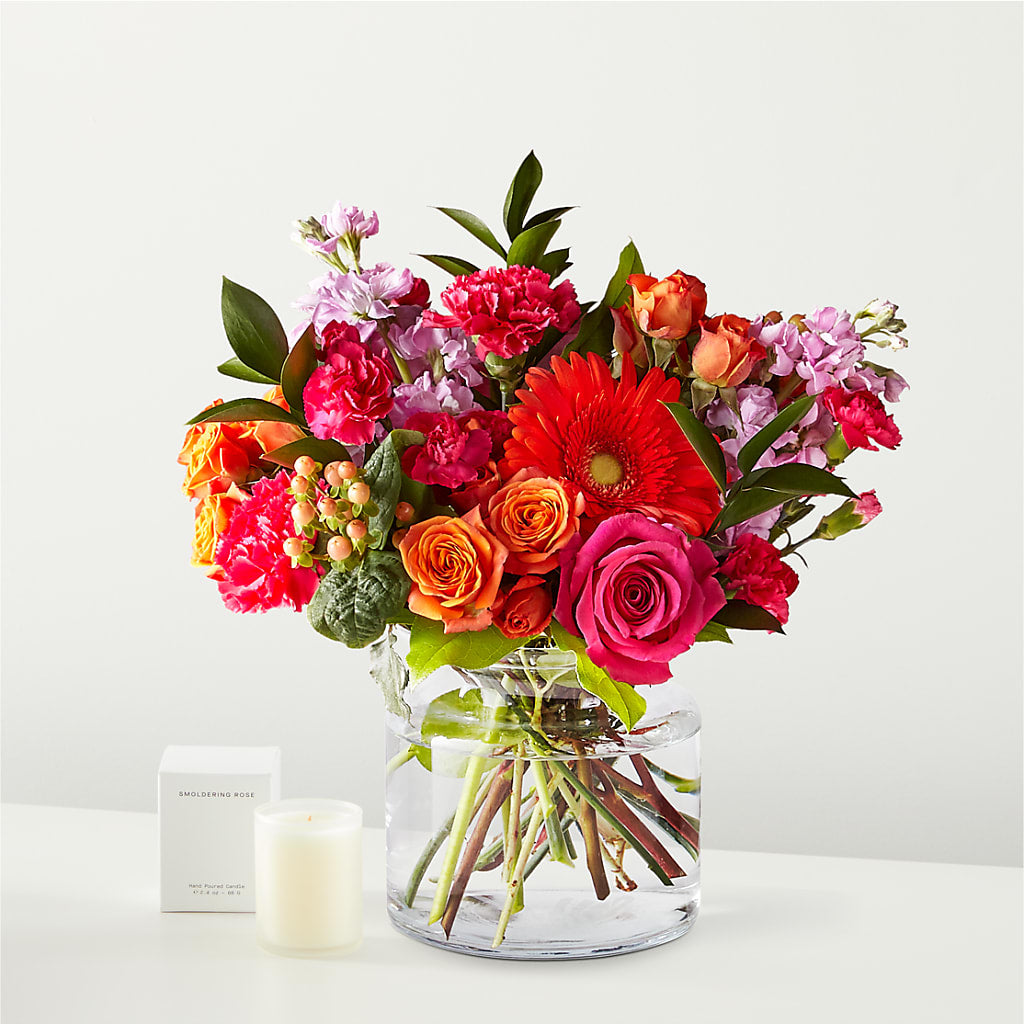 Send a celebration worthy of the woman who does it all. The bright blooms of our Fiesta Bouquet, combined with our luxurious Smoldering Rose votive candle, a "Happy Mother's Day" Lovepop card, and artisan chocolates create a burst of excitement as soon as it arrives.